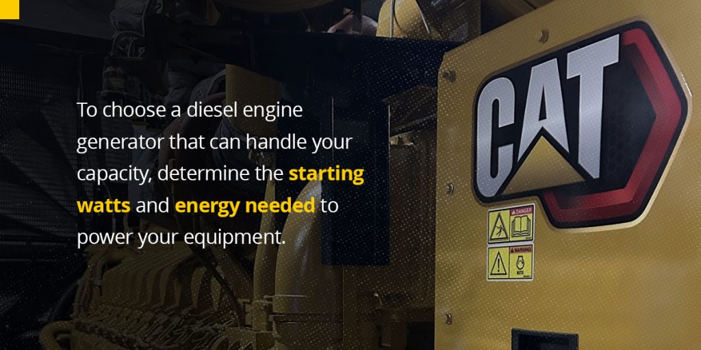 Purchasing a higher-capacity generator that can handle your business’s needs can help prevent overloading the generator. To choose a diesel engine generator that can handle your capacity, determine the starting watts and energy needed to power your equipment. Otherwise, it might make sense to invest in more than one generator.
